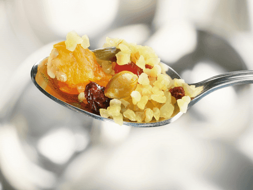 Melt butter in a pan and fry the dried fruits, soaked for several hours and chopped into small pieces. Fry for three minutes, then add lemon juice, pistachios, honey, and simmer, stirring, for two minutes.