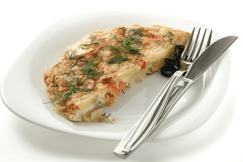 Frittata with smoked salmon and mushrooms is a refined dish of European cuisine that captivates with its delicate taste and rich aroma. Originating from Italy, frittata is a close relative of the omelet but differs in its denser structure and variety of fillings. In this version, juicy smoked salmon pairs beautifully with the rich flavor of mushrooms, creating a harmonious duet highlighted by the creamy texture of eggs and a hint of spiciness from green onions. The final touch is melted parmesan, adding a subtle salty note. Frittata is perfect for an exquisite breakfast or a light dinner served with crispy bread and fresh vegetables. Its versatility makes the dish sought after in any gastronomic context, whether it's a cozy family breakfast or a stylish brunch with friends.