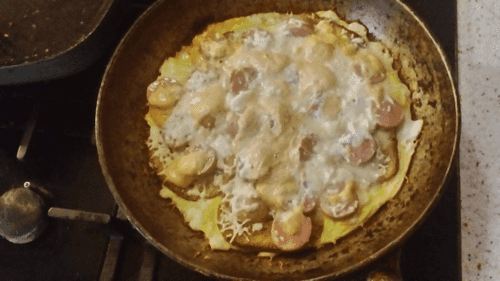 Pizza on a frying pan made of bread