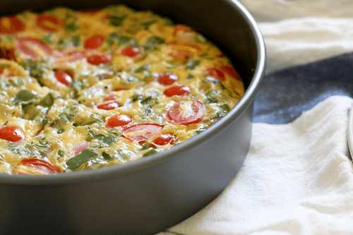 Grease the pan with the remaining olive oil, pour in the eggs, and sprinkle with vegetables. Top with diced cheese and gently press everything down. Place on medium heat for 3 minutes until the frittata sets at the edges. Then transfer to the oven for 15-20 minutes until cooked.