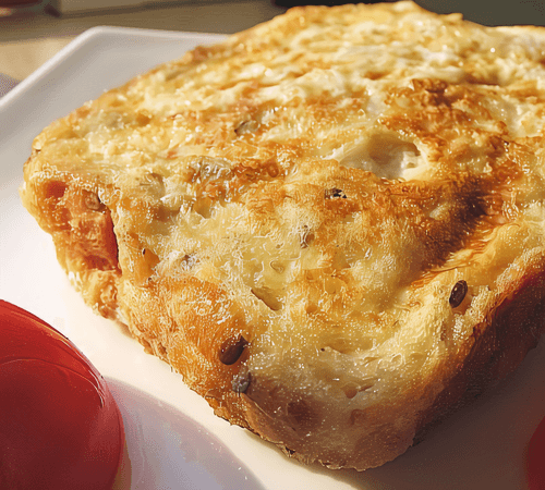 Cheesy French toast in an omelet is the embodiment of cozy French cuisine, where simplicity meets sophistication. The dish resembles a classic French toast but with a savory egg coating and gooey cheese. Crispy white bread is first toasted to a golden crust, then topped with a layer of aromatic melted cheese, and finally poured over with airy omelet. During cooking, the eggs seep under the bread, creating a tender texture and rich flavor. The toast can be served for breakfast or as a light snack, pairing it with greens, fresh vegetables, or even sauces. This dish offers morning warmth and refined French elegance in every bite.