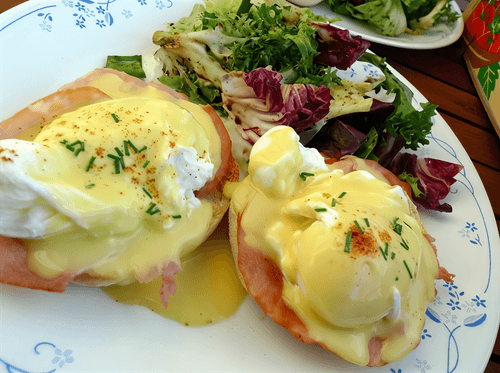 Benedict eggs are a symbol of refined breakfast born in America. The story goes that the dish emerged in the 19th century thanks to an inventive customer at New York's Delmonico’s restaurant who wanted something special after a wild night. The combination of tender poached eggs, crispy bacon, airy English muffins, and velvety hollandaise sauce creates a rich palette of flavors—creamy, spicy, slightly tangy, and wonderfully harmonious. This dish is perfect for a late breakfast or a cozy Sunday morning. It is enjoyed by savoring each layer: first the softness of the egg, then the salty depth of the bacon complemented by the sauce's acidity. This elegant breakfast has become an integral part of gastronomic culture and embodies the sophistication of morning meals.