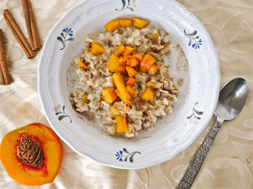 Creamy oatmeal with peaches is a refined blend of tenderness and aromatic sweetness. Inspired by Russian culinary traditions, this breakfast offers comfort and delight. Tender Hercules cooked in a mixture of milk and cream reveals a soft texture, while the addition of vanilla bean adds a delicate sweet note. Ripe peaches, lightly caramelized with sugar, weave into the porridge with juicy bursts of flavor, creating harmony between delicate and fruity tones. A light pinch of cinnamon finishes the dish with a subtle spicy accent. This porridge is perfect for leisurely morning meals, filling the day with warmth and coziness.
