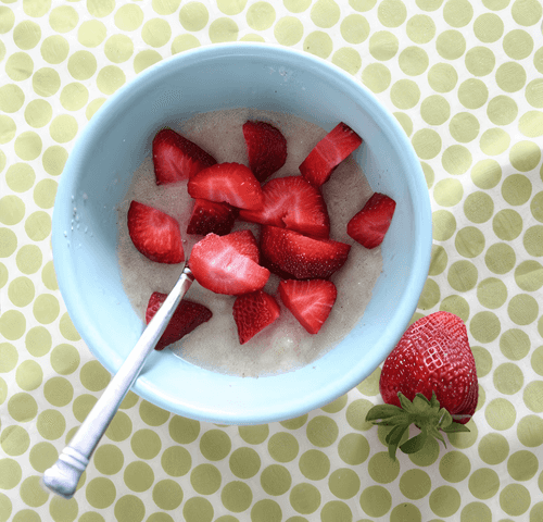 Serve the porridge decorated with fresh strawberries.