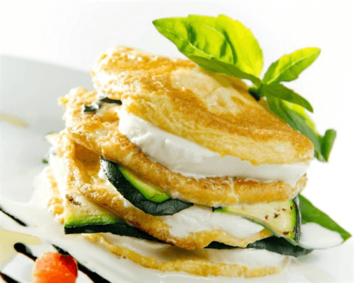 The pyramid of omelette and mozzarella is an elegant dish of Italian cuisine that combines the tenderness of the omelette, the freshness of zucchini, and the creamy texture of mozzarella. Its origin is linked to the traditions of Mediterranean gastronomy, where simple ingredients are transformed into exquisite creations. The taste surprises with a balance of lightness and richness, while the aroma of basil and balsamic vinegar adds depth. This pyramid will adorn any table—be it breakfast, a light dinner, or a festive reception. The layered structure makes each forkful interesting, revealing new flavor nuances. It is not just an appetizer but a true gastronomic masterpiece filled with harmony of classic Italian components.
