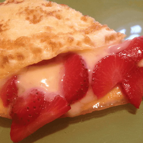 When the eggs are almost ready, place cheese on half of the omelet, sprinkle with sugar, and add strawberries. Fold the omelet in half and cook for another 2 minutes with the lid on.