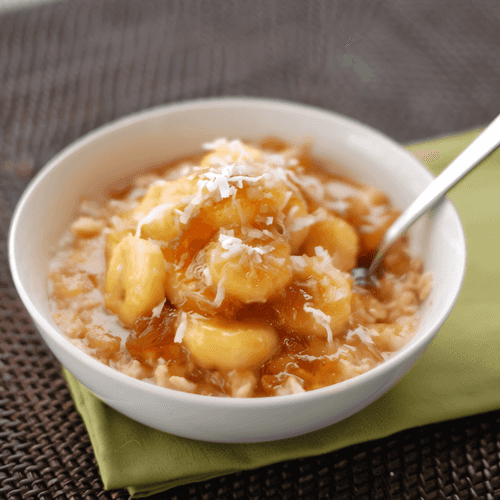 Oatmeal with banana and fig-caramel sauce is a true delight for lovers of gentle and sweet breakfasts. This recipe harmoniously combines the creamy texture of oatmeal, caramelized bananas, and the rich fruity flavor of figs. It may draw inspiration from European traditions where oatmeal is a popular morning choice. The caramel sauce adds a warm depth of flavor while the fig brings a refined sweetness. It's best served hot with a sprinkle of coconut flakes for an exotic touch. This breakfast is not only nutritious but also aesthetic: the appetizing caramelized bananas in sauce turn ordinary oatmeal into a culinary masterpiece.
