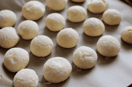 Sprinkle a small amount of flour on the table. Use a dessert spoon to take some dough, roll it in flour, and form a ball. Continue rolling until the dough no longer sticks to your hands. The essence of this technique is that there is much more flour on the surface than in the dough itself. When baking, the delicate dough will increase in volume by about one and a half times, and the flour crust will help form a structure that holds the delicate texture inside. Place the shaneshki on baking paper and transfer to the baking tray.