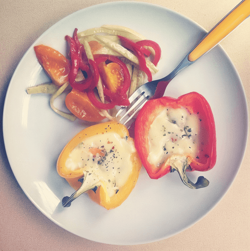 Eggs baked in peppers under mozzarella, and warm vegetable salad