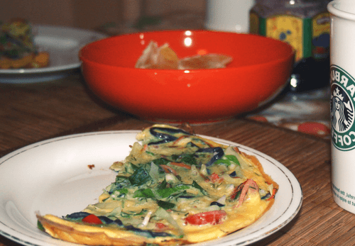 Lightly beat the eggs with milk, add spices. Pour the eggs over the vegetables and sprinkle everything with fresh herbs.