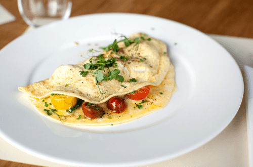 The classic French omelet is a model of sophistication and simplicity, embodying the spirit of French cuisine. Light, airy, and tender, it offers a perfect balance of textures and flavors. Its history goes back centuries, being an integral part of France's gastronomic culture. The main secret is the right cooking technique: eggs are whisked with milk and spices, then slowly cooked in butter until soft. Adding fresh green onions, juicy cherry tomatoes, and aromatic parmesan gives the dish an interesting flavor accent. The omelet is folded in half to create an exquisite shape and delicate filling. It is served as a standalone dish or accompanied by fresh bread and a light salad. This is not just breakfast; it's true gastronomic elegance in every bite.