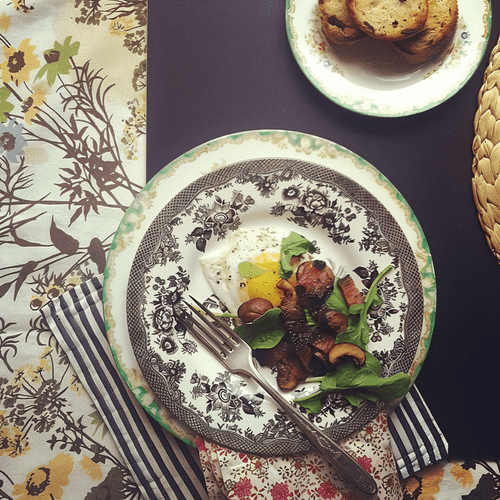 Toast the bread. Add the mushrooms, and cook the eggs in the pan, seasoning with salt and pepper.