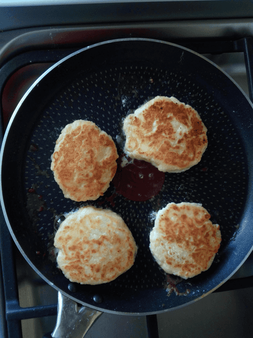 Melt butter in a pan, spoon onto the pan, and bake into small flat cakes over medium heat until a tender golden crust forms. Optionally, you can add a bit more flour. I don't add it, as it thickens the cottage cheese and gives a flour taste. With two tablespoons of flour, the cheese pancakes will be soft and may be difficult to flip in the pan, so try covering them with a lid while frying on both sides.