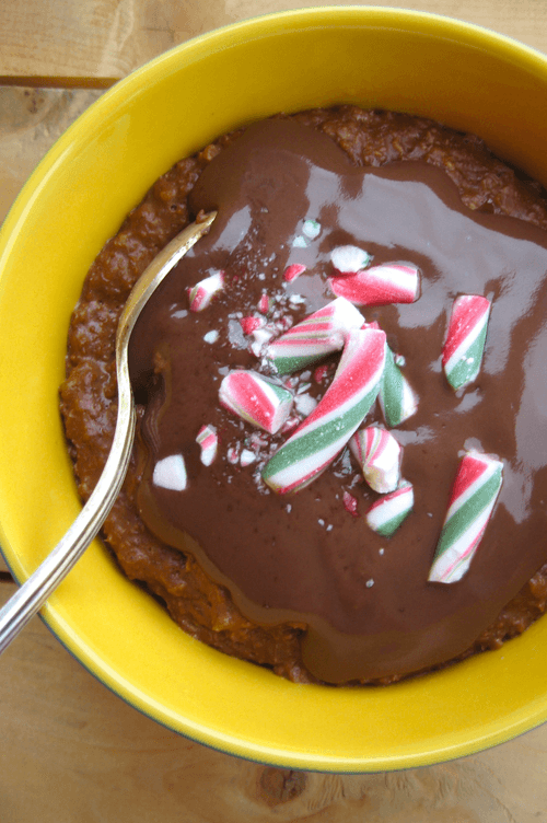 Oatmeal with chocolate pudding and mint caramel