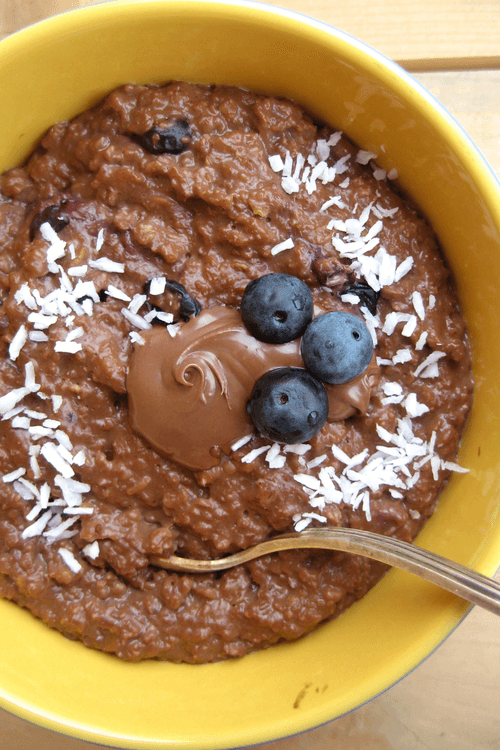 Serve the porridge in bowls and optionally sprinkle with coconut flakes/blueberries/Nutella.