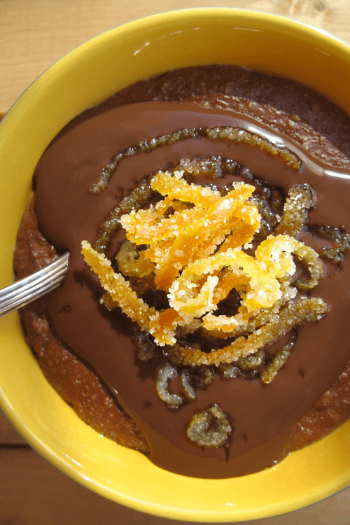 Boil milk in a saucepan, add cocoa powder, cane sugar, and cinnamon, mix and cook for a minute. Add oats and cook, stirring occasionally, until desired thickness. Remove from heat and serve on plates. Serve the porridge with chocolate pudding and candied zest. Use the naked oranges, left without zest, for morning fresh juice. Enjoy your breakfast!