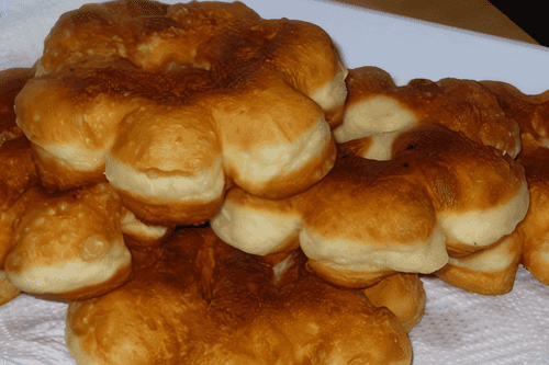 Spoon the dough into heated vegetable oil in a pan (I got 13 puffs from this amount of dough). Fry on one side for a few minutes over slightly less than medium heat. The puffs should rise significantly in height (mine definitely doubled).