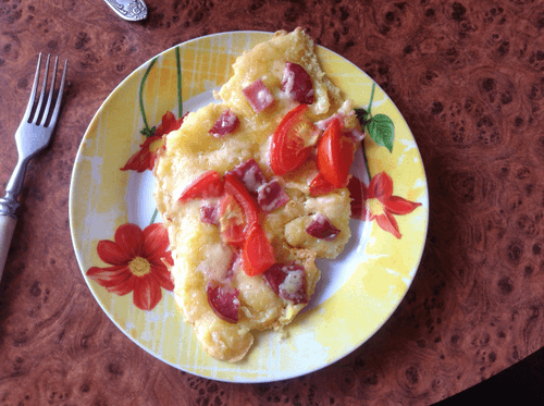 Whisk sour cream (mayonnaise) with an egg, add flour. Spread the dough on a dry heated pan. Top with filling (fried mushrooms, ham, pieces of boiled chicken, tomatoes). Generously sprinkle with grated cheese and herbs.