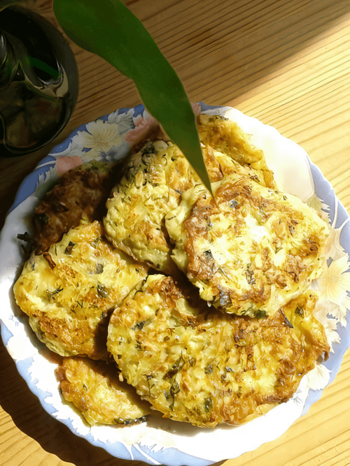 Spoon the mixture onto the skillet to form pancakes. Fry for 3-5 minutes on each side over medium heat.