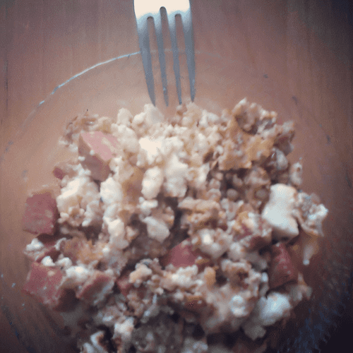 Add buckwheat to cheese, onion, and salami, and pour in the egg.