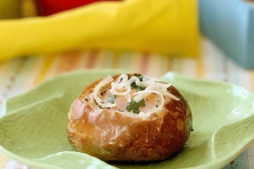 Preheat the oven to 180 degrees. Cut the top off each bun and remove the soft bread, leaving the sides intact. Brush the inside of each bun with melted butter, salt, and pepper.