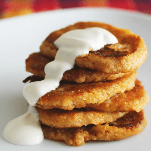Dip the cold mixture in breadcrumbs (I used some crushed Japanese tempura coating) and form pancakes. Fry in vegetable oil over medium heat.