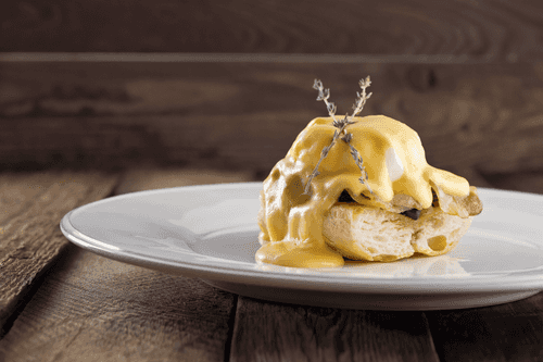 On toasted bread, we place spinach, bacon, and poached egg. We drizzle with hollandaise sauce.