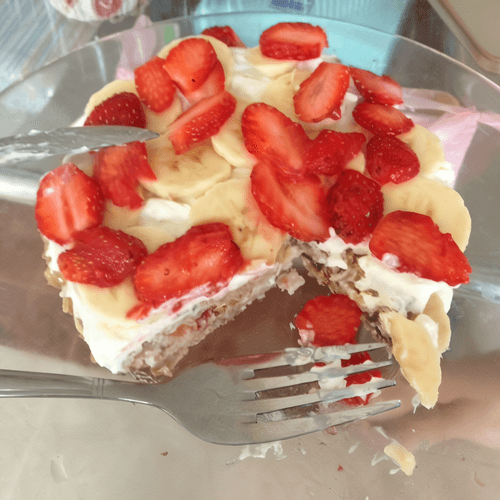Mix cottage cheese with yogurt, place the first pancake on a plate, and evenly spread the yogurt-cottage cheese mixture on it, then top with sliced fruits/berries, nuts, or any additions to your taste, and cover with the second pancake. Repeat the same process with it.