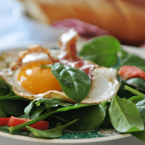 I place it on arugula and drizzle with balsamic cream — this is the simplest option (you can also make it with mushrooms, green beans, etc.).
