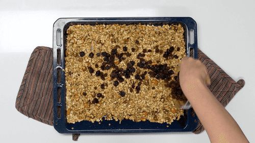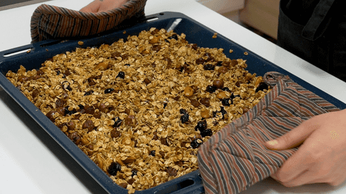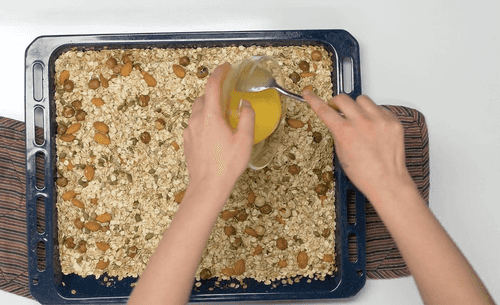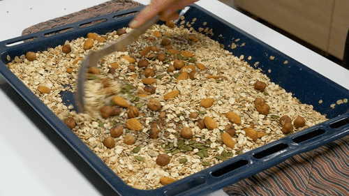 Check the granola; if the nuts are toasted and the oats have turned golden, the granola is ready. Cool on the baking sheet for 25 minutes.