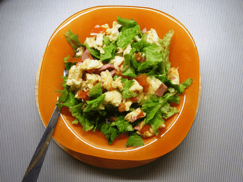 Cut iceberg lettuce into small strips. You can arrange it on a plate in the shape of a nest and place an omelet in the center. Alternatively, mix it with hot omelet (but not in the pan) and serve afterward. If mixed immediately, the salad becomes warm and softer.