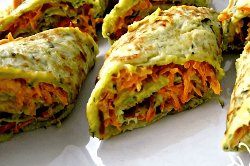 Zucchini pancakes with filling are a refined dish of Georgian cuisine, combining the tenderness of vegetable dough and the spiciness of the filling. Zucchini, minced to an airy consistency, creates a light and porous dough enriched with aromatic spices and fresh dill. The pancakes turn out thin and elastic, while their golden crust gives an appetizing appearance. The filling made of carrots, garlic, and mayonnaise adds pleasant sweetness and spiciness, making the dish rich and balanced. Traditionally, such pancakes are served as an appetizer or light dinner, accompanied by sauces or fresh vegetables. This treat is perfect for both family dinners and festive tables, delighting with its rich flavor and originality.