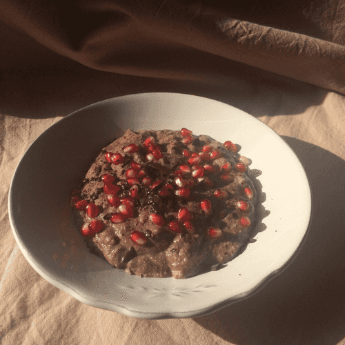 Serve in portion bowls and sprinkle with pomegranate seeds and grated chocolate (preferably 85% cocoa).