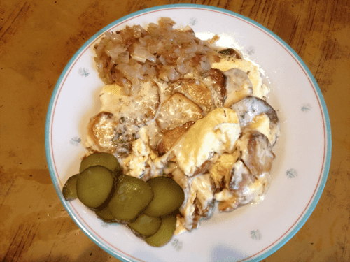 We turn off the fire and set the table. On each plate, we place a portion of scrambled eggs, a portion of fried onions, and a couple of pickles. Got the hint? Of course! We take out the fogged-up glass from the fridge.