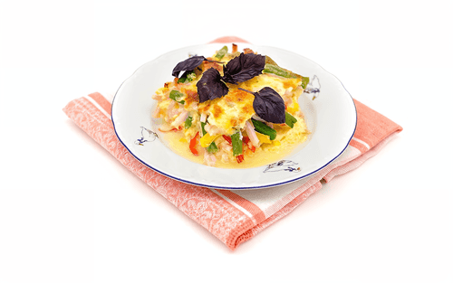 Grease the mold with butter, add the ham and vegetables, level the surface, and pour in the egg mixture.