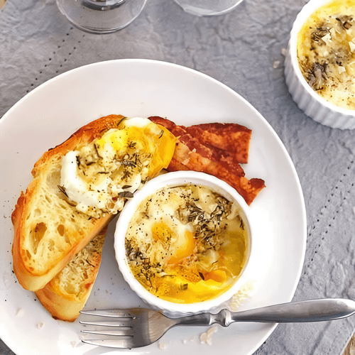 Eggs baked with cheese and herbs are a refined dish of European cuisine that combines simplicity and sophistication. Its roots trace back to old culinary traditions where fresh ingredients and aromatic herbs played a key role in creating morning delights. The taste of this dish is delicate, creamy, with light woody notes of thyme and rosemary. The baked egg white retains an airy texture while the liquid golden yolk smoothly envelops the components, creating a harmony of flavors. The decorative crust of parmesan adds a piquant richness, while the accompanying crispy bread completes the picture of the perfect breakfast. This dish will become a morning ritual for connoisseurs of taste and aesthetics, awakening appetite and providing inspiration for the entire day.