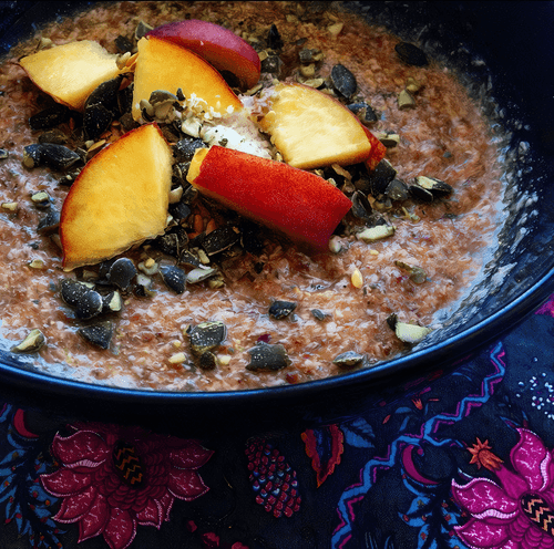 Garnish the flaxseed porridge with pumpkin seeds and pieces of peach.