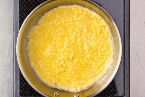 Pour in the beaten eggs and stir them in the pan with circular motions using a whisk, frequently shaking the pan. At this stage, it's important to achieve a uniform creamy consistency. When the mixture starts to noticeably thicken, stop stirring and let the omelet rest for 30 seconds to set slightly at the bottom. Lift the edges with a spatula.