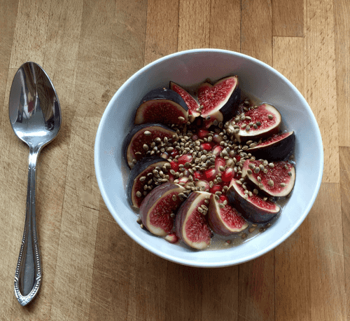 Layer in a serving bowl: oatmeal, pomegranate seeds around the edges, fig in the center. Pour soy milk (0.5 cup in each bowl). Sprinkle with hemp seeds.