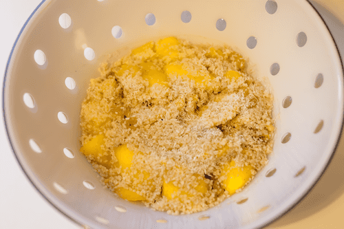 While the couscous is cooking, peel the mango and cut it into pieces. Mix with the couscous.