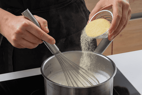 Quickly pour semolina into the milk in a thin stream while whisking. Cook for 5 minutes, stirring constantly to avoid lumps.