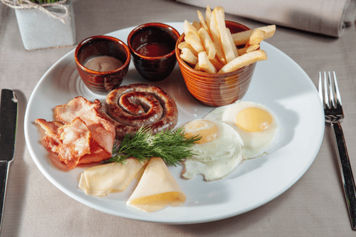 Slovenian breakfast is a hearty and aromatic dish rooted in the traditions of Yugoslav cuisine. Its base is a crispy bun that combines the rich flavors of bacon, Gouda cheese, spicy ketchup, and mustard. The picture is complemented by a golden fried egg and appetizing sausages grilled to perfection. A side of crispy French fries adds completeness to the dish and makes it a true morning delight. This breakfast is especially popular among lovers of hearty and nutritious meals, perfect for starting a productive day. The combination of salty, sweet, and spicy creates a rich palette of flavors that is hard to resist. This dish provides energy and comfort while its appetizing aroma awakens you and sets you up for a great day!