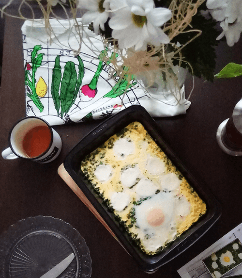 Breakfast according to Sebastian Zavatsky's recipe - egg casserole with spinach, cream and mozzarella. Cheese and vegetable tenderness.