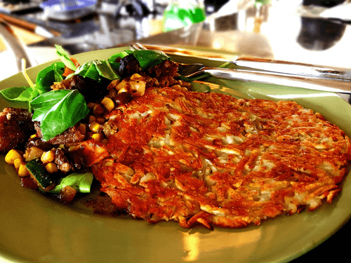Grate the vegetables on a coarse and fine grater, mix in a deep bowl, add flour, salt, and spices, herbs. The mixture for draniki is ready.