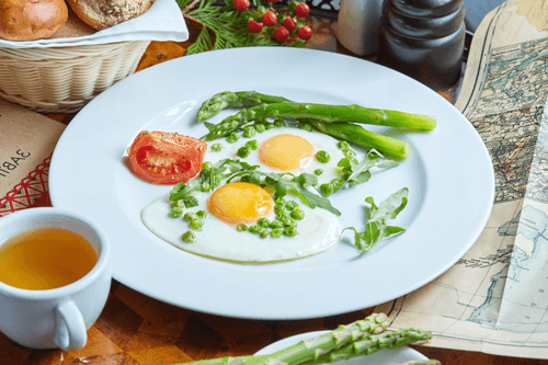 Scrambled eggs with young peas and asparagus is a refined dish with notes of spring freshness. Light, tender, and nutritious, it pairs well with crispy arugula leaves and ripe tomatoes, creating a harmony of flavors. This dish harks back to Russian traditions of simple yet exquisite cuisine where fresh seasonal ingredients take center stage. The egg white envelops the sweet peas and juicy asparagus while the golden yolk remains soft and creamy. The subtle aroma of vegetable oils enhances the natural beauty of the ingredients, while fresh vegetables add brightness and expressiveness. An ideal choice for a light breakfast or elegant snack, this scrambled egg will delight those who appreciate natural flavor and simplicity in preparation.
