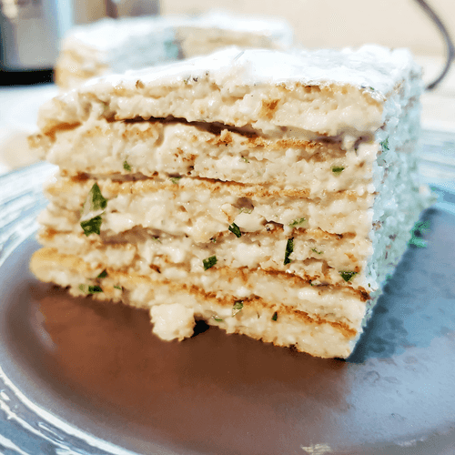 It can be served as a cake, with each layer spread with sauce, or separately.