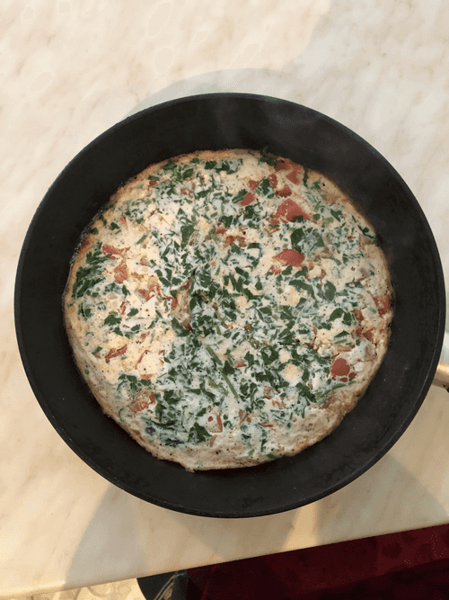 Chop the tomatoes and add them to the eggs. Add to the onion and chop the greens as well. Cook until done.