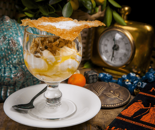 Спитико Яурти — это воплощение традиционного греческого гостеприимства. Нежный, густой йогурт, приготовленный с заботой, обогащается ароматным медом и хрустящими грецкими орехами, создавая гармонию вкусов — от сливочной мягкости до сладкой медовой глубины. Этот десерт не только питательный, но и невероятно приятный. Его часто подают в греческих семьях на завтрак или в качестве легкого угощения после трапезы. Добавленные листы теста фило придают дополнительную текстурную игру, делая блюдо ещё более изысканным. Спитико Яурти — это не просто йогурт, а кусочек средиземноморской истории, где каждое сочетание ингредиентов раскрывает древние традиции вкуса и домашнего уюта.