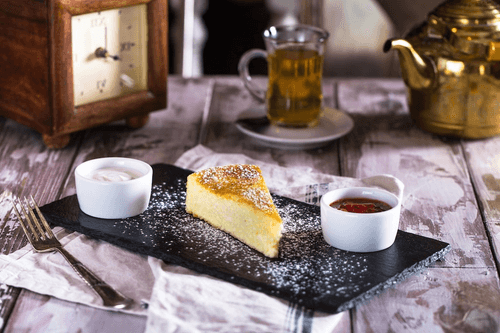 Cut the finished casserole into triangles and sprinkle with powdered sugar.