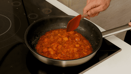 Добавить помидоры, нарезанные кубиком, измельченный чеснок, копченую паприку, сахар, соль, кумин и орегано. Готовить еще 5-7 минут на среднем огне.